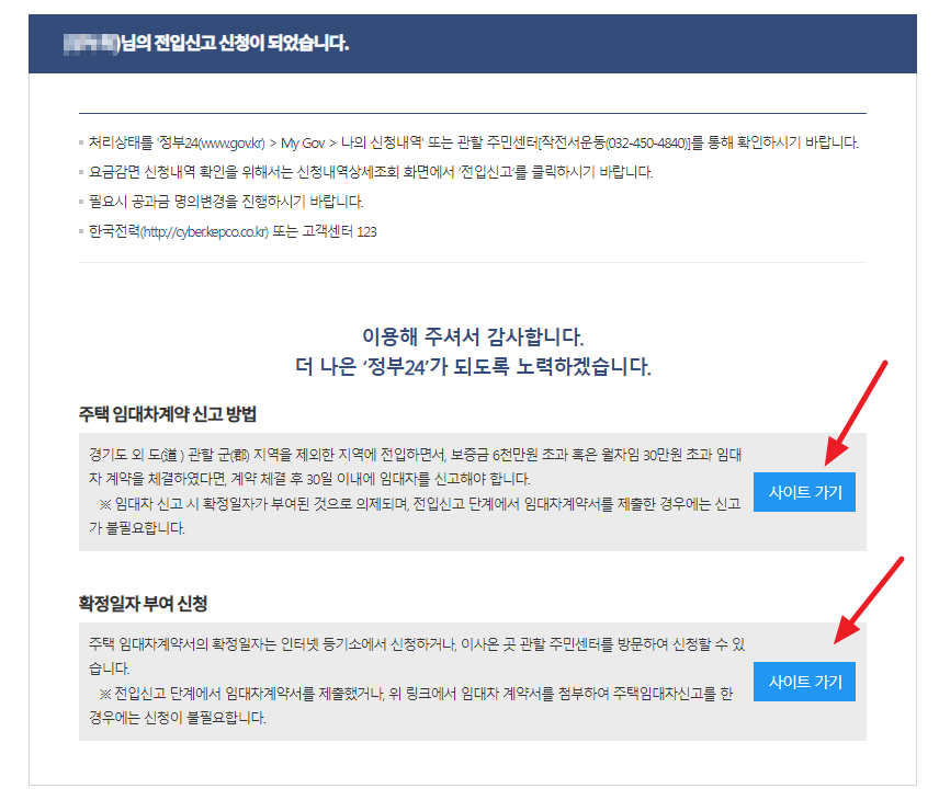 이제 전입신고가 완료되었으며 다음으로 주택 임대차계약 신고와 확정일자 부여 신청을 해야합니다.