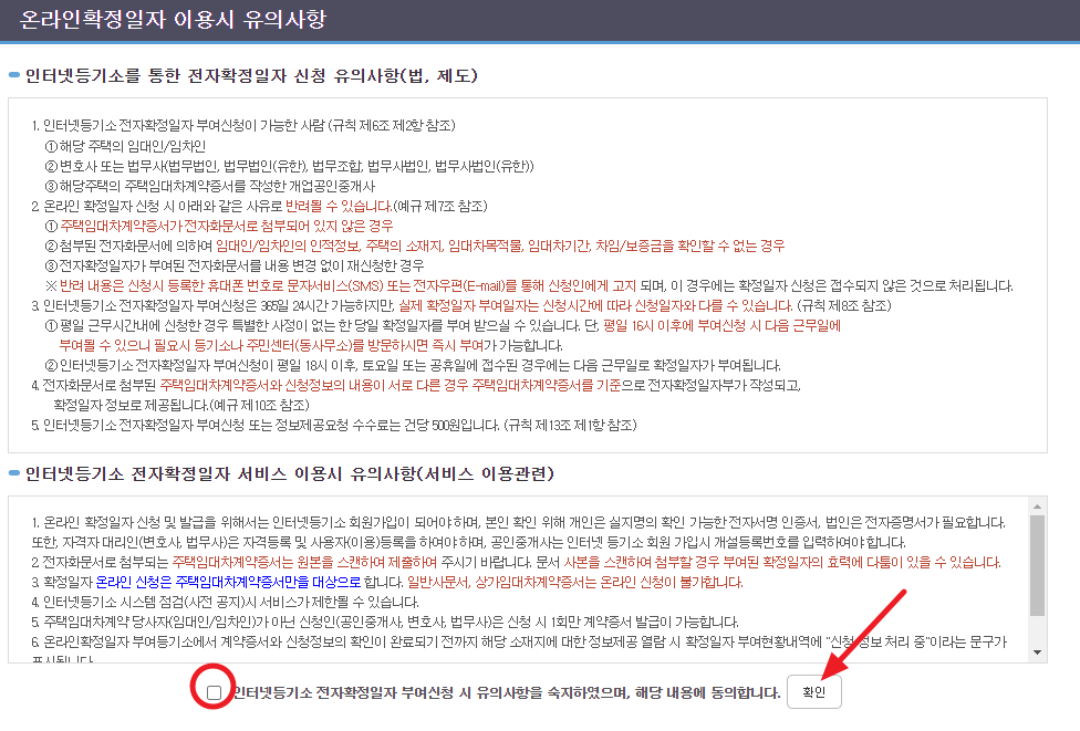 유의사항이 나오면 "인터넷등기소 전자확정일자 부여신청 시 유의사항을 숙지하였으며, 해당 내용에 동의합니다"에 체크하고 "확인"을 누릅니다.(개인의 경우 실명 확인이 가능한 전자서명 인증서가 있어야 한다는 내용이며 상가임대차계약이 아닌 주택임대차계약증서만을 대상으로 한다는 내용입니다.)