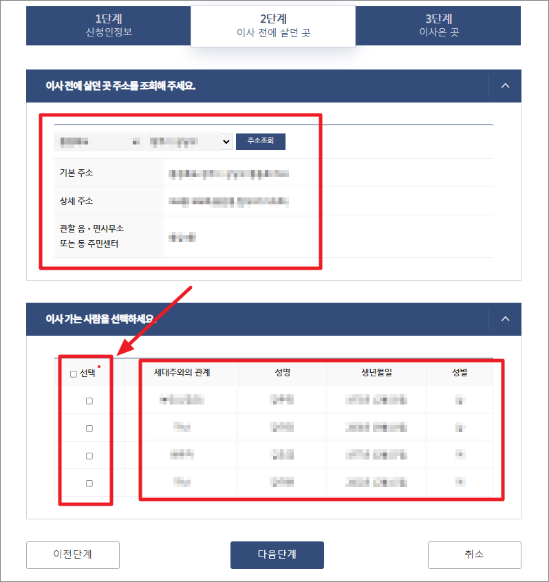 이사 온 곳의 주소를 입력하고 다가구 여부를 선택 후 이사온 사람끼리 세대 구성(빈집으로 이사)을 선택합니다.