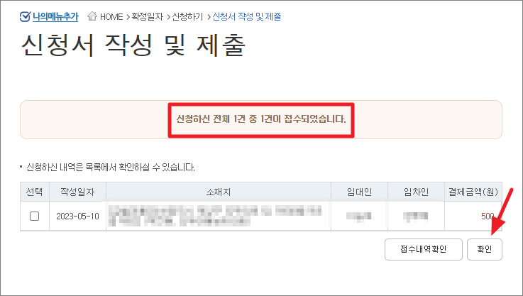 위 화면처럼 '제출완료'가 되었으면 확정일자 부여신청을 인터넷으로 성공적으로 마무리한 것입니다.