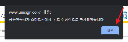 이제 끝났습니다. 공동인증서가 스마트폰에서 PC로 정상적으로 복사되었습니다.