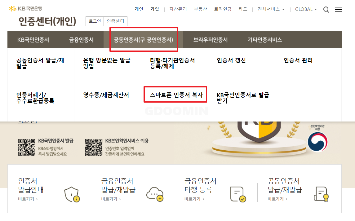 인증센터(개인)을 누르면 나오는 화면에서 '공동인증서(구 공인인증서) 하위 메뉴에 '스마트폰 인증서 복사'를 누릅니다.