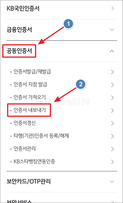 인증센터에서 '공동인증서'로 들어가고, 하위 메뉴에서 '인증서 내보내기'를 누릅니다.