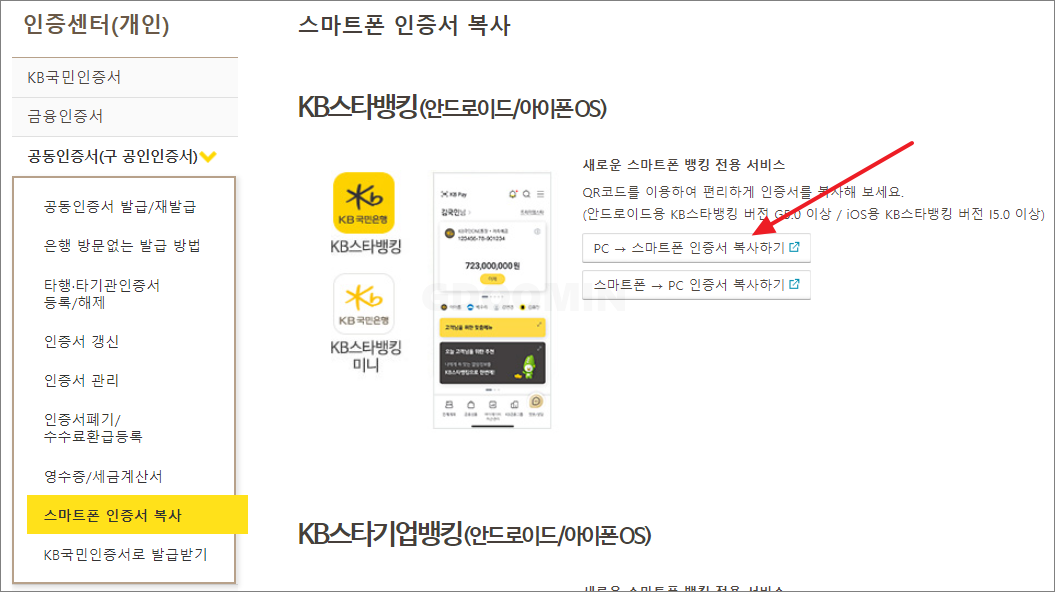 KB스타뱅킹(안드로이드/아이폰OS)에 있는 'PC→스마트폰 인증서 복사하기'를 들어갑니다.