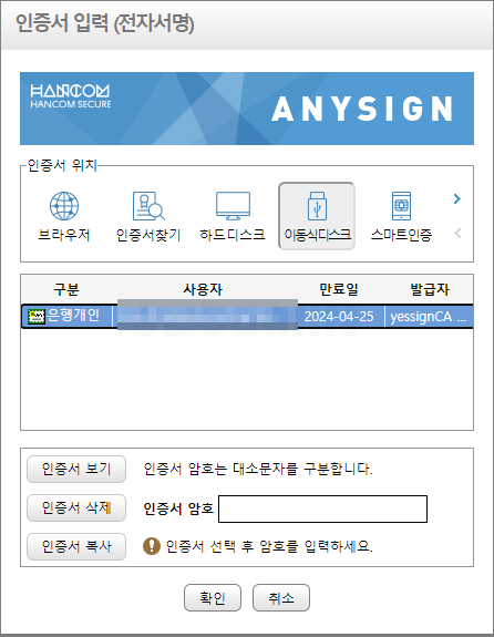 이제 공동인증서가 필요한 곳에서 이동식디스크 또는 하드디스크를 누르면 위 화면처럼 공동인증서가 나타나게됩니다.