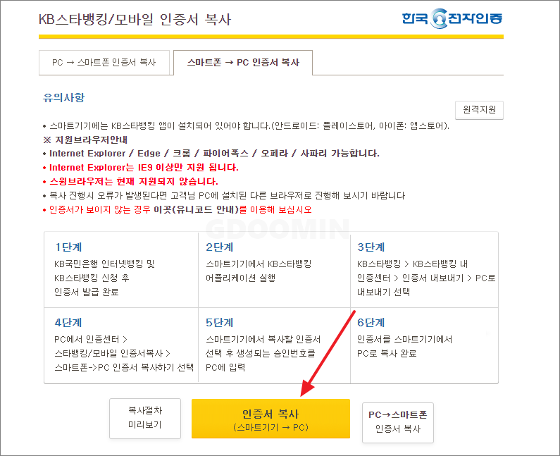 '스마트폰→PC인증서 복사'탭을 선택했으면 아래쪽에 노란바탕에 검정글씨로 쓰여진 '인증서 복사(스마트기기→PC) 누릅니다.