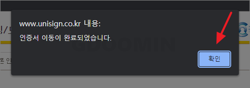 완료가 되면 '인증서 이동이 완료되었습니다'라고 나옵니다.