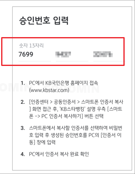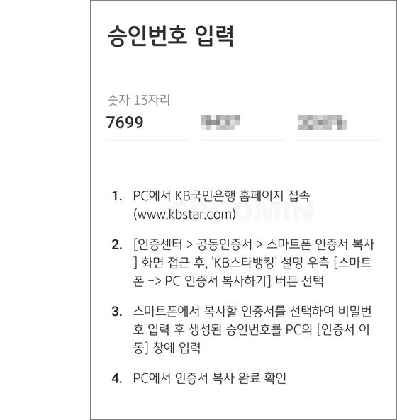 인증서 암호를 입력하고 나면 '승인번호 입력'이라는 화면이 나오는데요. 이제 PC에서 kbstar.com으로 들어가야 합니다.