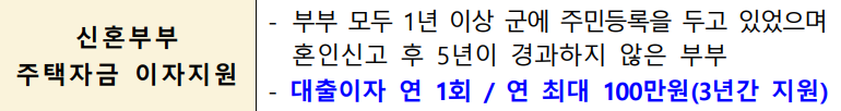 청년부부 정착장려금(연 50만원)과 신혼부부 주택자금 대출이자(최대 500만원)를 지원하고,