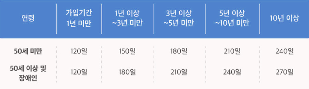 퇴사 시 자신의 만 나이와 보험가입기간(피보험기간)이 얼마나 되는지를 확인하여 실업급여 지급일수(=소정급여일수)가 얼마나 되는지를 결정하게 됩니다.