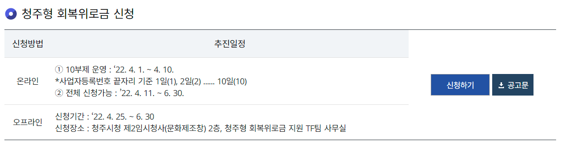 ◦ (온 라 인) 청주시 홈페이지 → 재난지원금 지원사업 신청 → 청주형 회복위로금 지원 신청