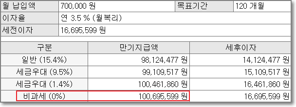 사실 원금 70만 원을 120개월 동안 3.5%의 월복리로 적금을 하면 원금은 8400만 원, 세전이자는 16,695,599원으로 완전한 비과세일 경우 100,695,599원으로 1억 70만 원 정도 됩니다.