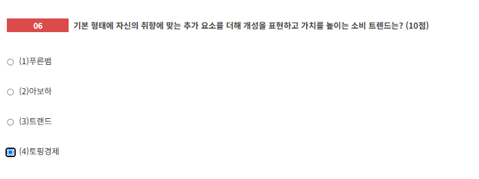 👉 기본 형태에 자신의 취향에 맞는 추가 요소를 더해 개성을 표현하고 가치를 높이는 소비 트렌드는? (10점)