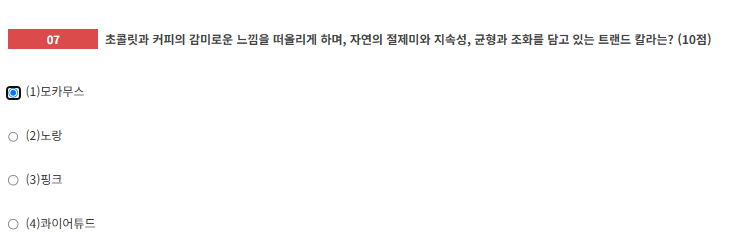 👉 초콜릿과 커피의 감미로운 느낌을 떠올리게 하며, 자연의 절제미와 지속성, 균형과 조화를 담고 있는 트랜드 칼라는? (10점)