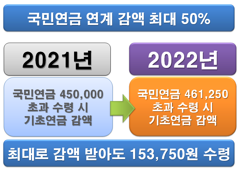 국민연금으로 받는 금액이 일정금액을 초과하게 되면 기초연금 금액 일부가 감액이 되고 있는데요. 2021년 국민연금 연계 감액기준이 21년 기초연금 기준액인 30만원의 150%인 45만원이었지만 2022년에는 기준금액인 307,500원의 150%인 461,250원을 초과해서 국민연금을 받게 되면 기초연금이 감액됩니다.