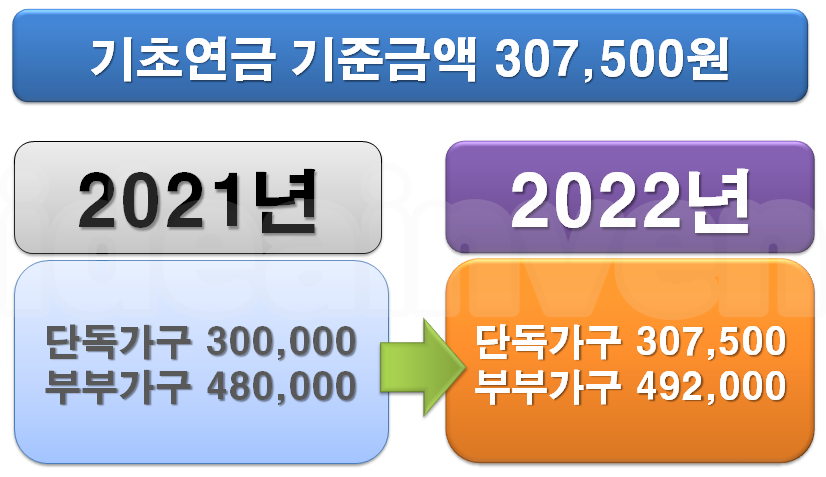 원래부터 기초연금은 5년마다 물가상승률을 반영하여 증가하도록 설정되었는데요. 기준금액이 30만원이던 것이 2022년에는 301,500원으로 예정되었다가 코로나로 인해서 물가가 예상보다 상승폭이 크면서 물가상승률을 2.5%로 적용하여 307,500원으로 인상됩니다.