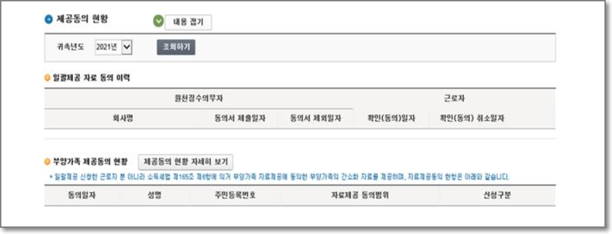 간소화자료 일괄제공 자료 동의 이력 및 부양가족 제공동의 현황은 위의 화면처럼 조회해볼 수 있습니다.