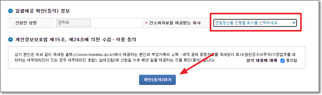오른쪽 위에 연말정산을 진행할 회사를 선택하고 아래쪽에 "확인(동의)하기"를 누르면 됩니다.