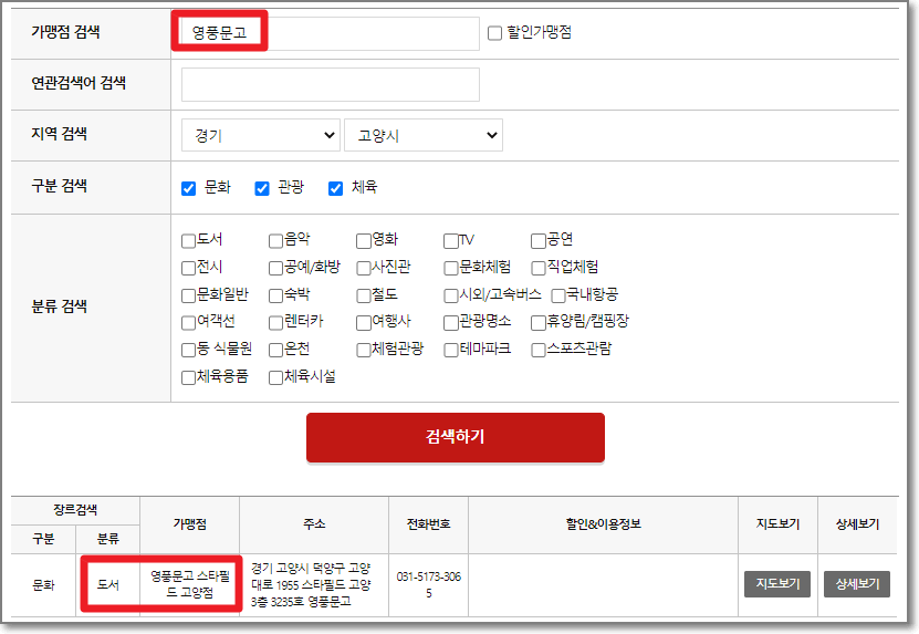 문화누리카드 오프라인 가맹점 찾기 바로가기를 눌러서 아래와 같은 창이 열리면 지역을 선택하고 구분의 3군데를 모두 체크하고 나서 검색하기를 누릅니다.