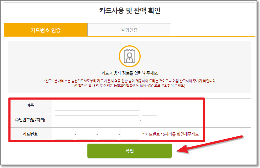 이름과 주민번호 앞자리 6개와 뒷자리의 첫자리 1개를 입력하고 카드번호를 입력한 후 확인을 누르면 잔액이 나옵니다.