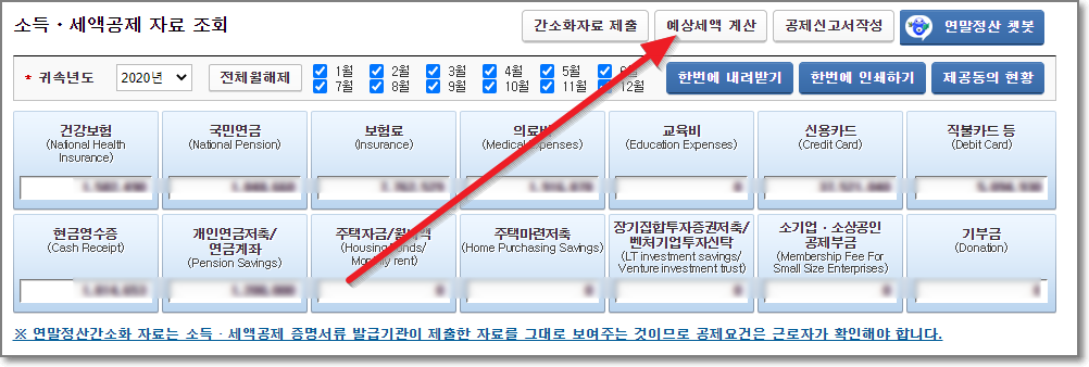 그럼 아래처럼 각 항목별로 해당하는 금액이 조회가 됩니다. 전산망이 너무 많이 좋아져서 이제는 대부분의 자료가 자동으로 끌어와집니다. 상당히 편리하게 변했습니다.
