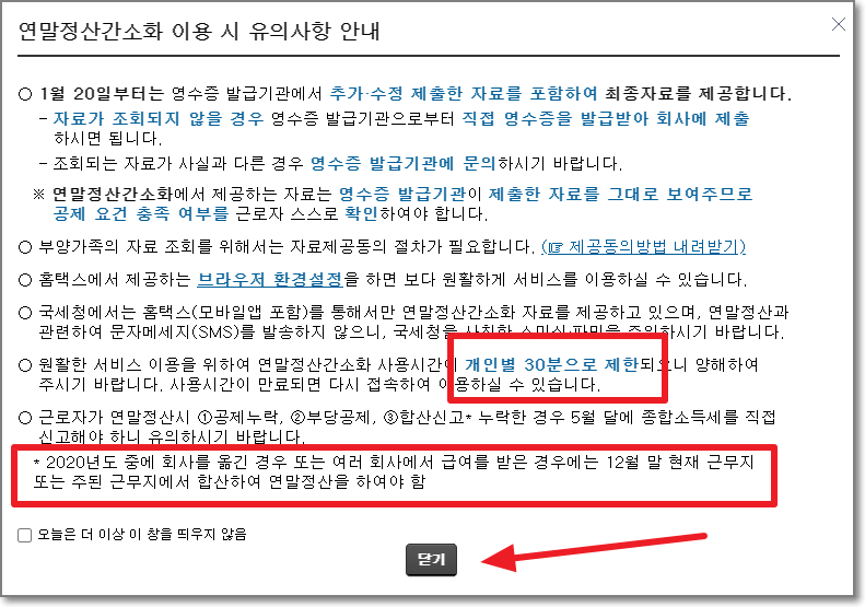위에서 보시는 것처럼 주어진 시간은 30분입니다. 그리고 2020년도 중간에 근무지를 옮긴 경우와 투잡으로 인해서 여러 회사에서 급여를 받은 경우에는 "12월 말을 기준"으로 다니고 있는 근무지에서 합산하여 연말정산해야 합니다. 유의하세요. 다 보셨으면 "닫기"를 누릅니다.