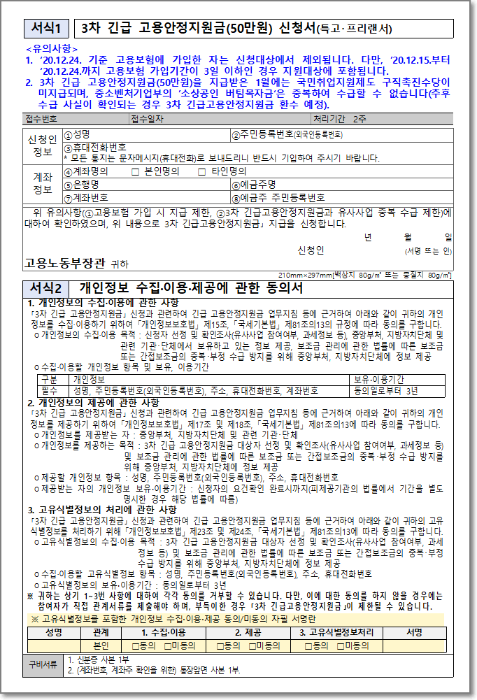 오프라인(고용센터 실제방문신청)으로는 2020년1월8일(금)과 1월11일(월) 딱 이틀간 업무시간(오전9시부터 오후6시)에만 신청가능합니다. 아래의 [3차 긴급고용안정지원금(50만원) 신청서(현장접수용)]을 출력해서 작성후 가지고 가시면 됩니다. 아래한글 파일과 PDF파일 두종류로 올려놓았습니다. 바로 열리는 PDF파일이 출력하기도 편하실 것입니다.