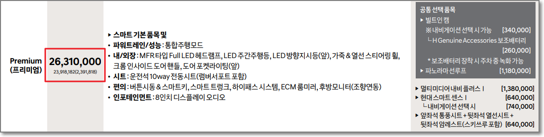 쏘나타 2.0 프리미엄 모델은 아래처럼 부가세포함 2631만원입니다. (어차피 6개월이내라면 위의 기준가액과 같습니다.)