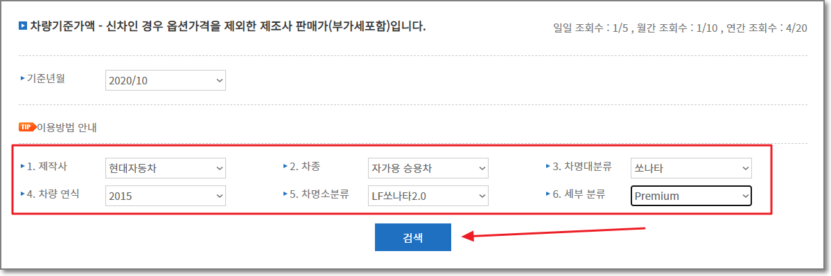 제작사/차종/차명대분류/차량연식/차명소분류/세부분류를 하나하나 선택을 합니다. 여기서는 쏘나타DN8 프리미엄으로 선택했습니다.(차량 연식은 차량등록증 상의 최초 등록년도입니다.) 검색을 누릅니다.
