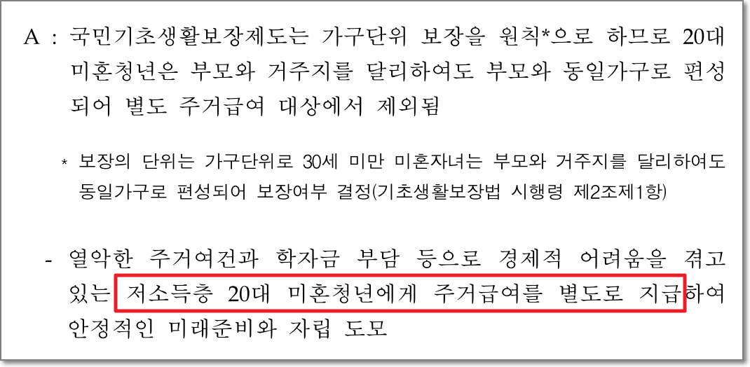 A : 국민기초생활보장제도는 가구단위 보장을 원칙*으로 하므로 20대 미혼청년은 부모와 거주지를 달리하여도 부모와 동일가구로 편성되어 별도 주거급여 대상에서 제외됨