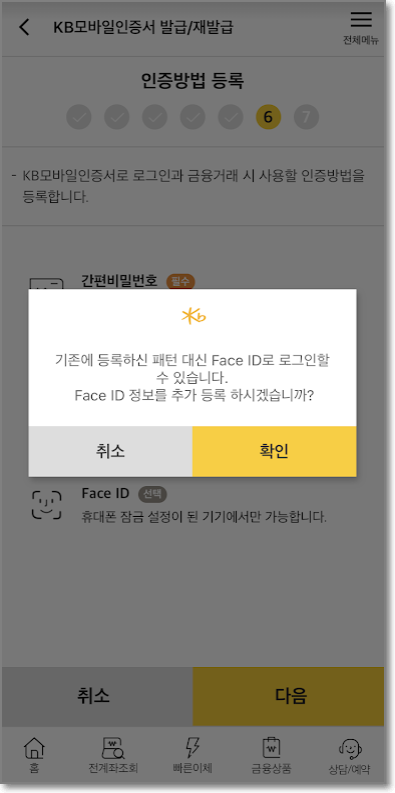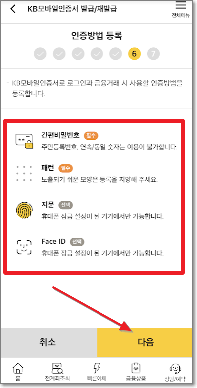 간편비밀번호와 패턴은 필수이고, 지문이나 FaceID는 선택입니다. "다음"을 누르면 기존 간편비밀번호를 입력하라고 나옵니다. 입력합니다.