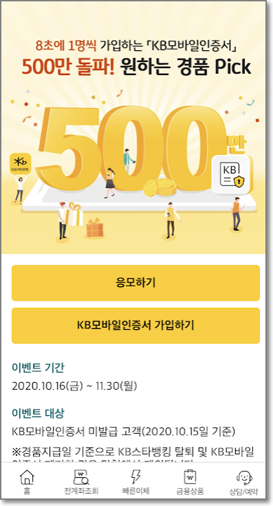 KB국민은행도 이미 벌써부터 공인인증서와 모바일 인증서를 겸해서 사용하고 있는데요. 이번시간에는 국민은행 모바일 인증서 발급방법에 대해서 알아보겠습니다.(기존에 핀번호 6자리나 패턴을 등록하셨어도 이번에 모바일인증서로 바꾸실 수 있습니다.)