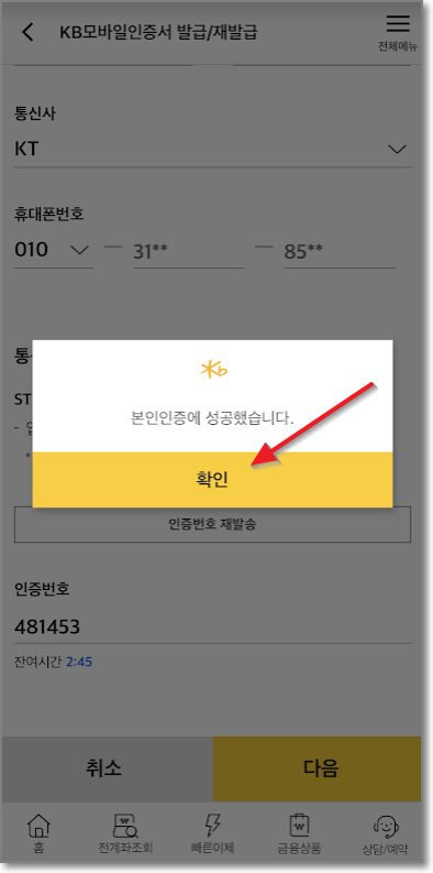 인증번호를 입력한 후 다음을 누르면 "본인인증에 성공했습니다"라고 합니다. "확인"을 누릅니다.