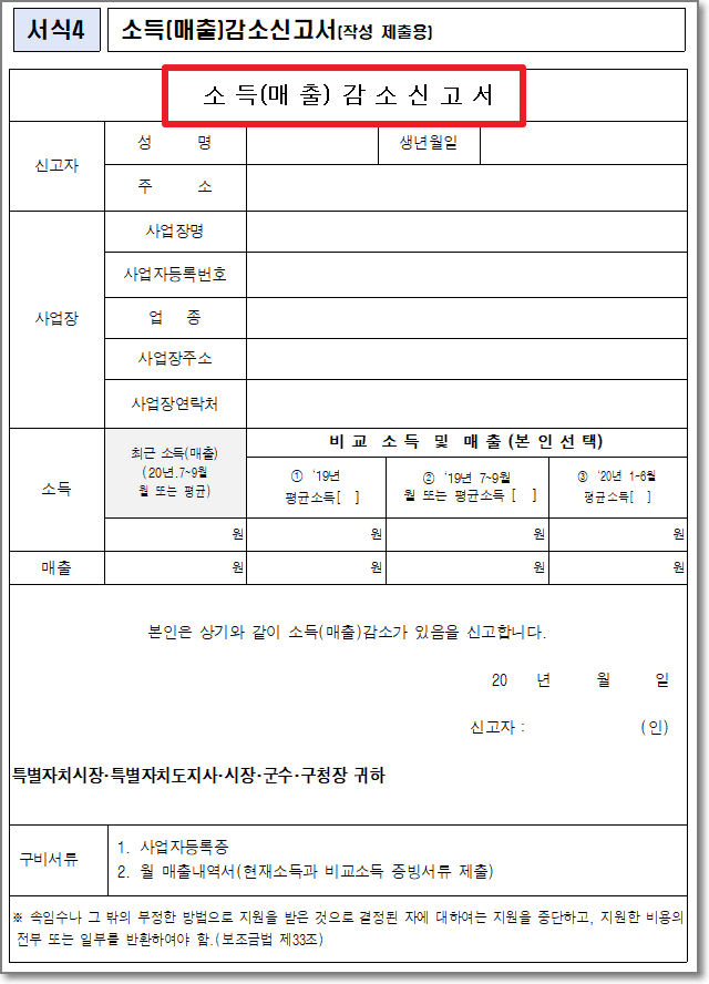 | [서식4] 소득(매출)감소신고서 | [서식4] 본인 작성 |