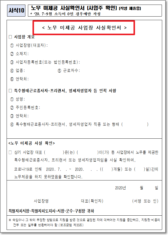 | ※’20.7~9월 소득이 0원인 경우 서식10〕노무미제공사실확인서 |