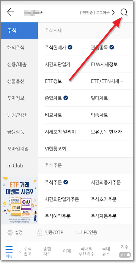 미래에셋대우 계좌가 개설되었고 m.Stock를 설치했다면 아래처럼 돋보기를 누릅니다.