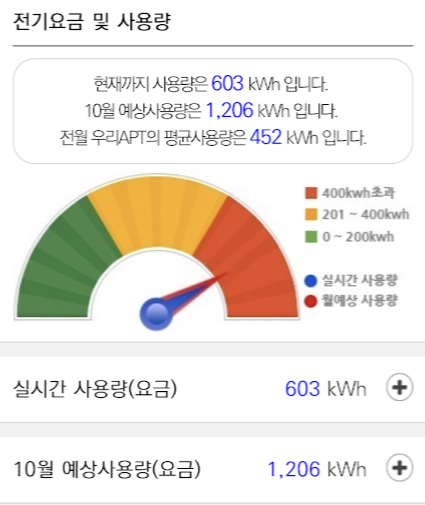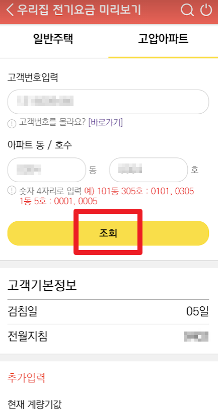 전기요금까지 조회를 해보고 싶으시면 아파트 동/호수를 입력하고 조회를 누릅니다.(동호수는 10층 이상 아파트 때문에 4자리 입니다. 204동에 사시면 0204를 입력하시면 됩니다. 조회를 누르면 아래 전월지침까지 딱 나옵니다.