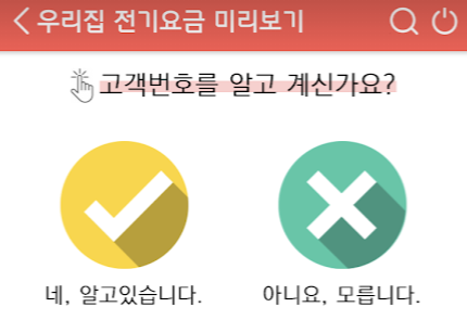한전고객번호를 알고 있냐고 물어봅니다. 한전고객번호를 모르니까 여기까지 왔는데요? "아니요, 모릅니다"를 터치합니다.