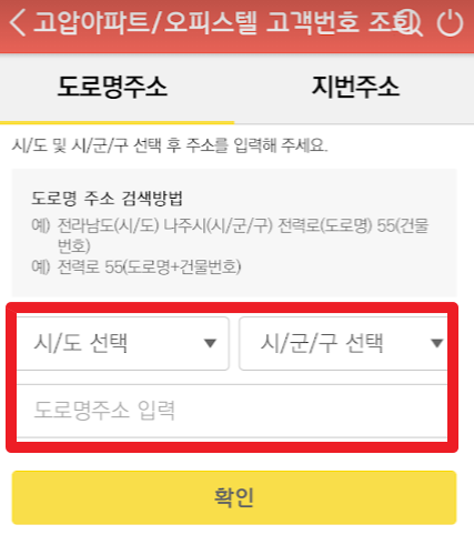 시/도 선택, 시/군/구 선택, 도로명주소를 입력하고 "확인"을 누릅니다.