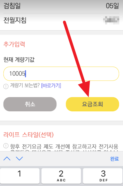 현재계량기 값을 보고 오신다음 입력하고 "요금조회"를 누릅니다.