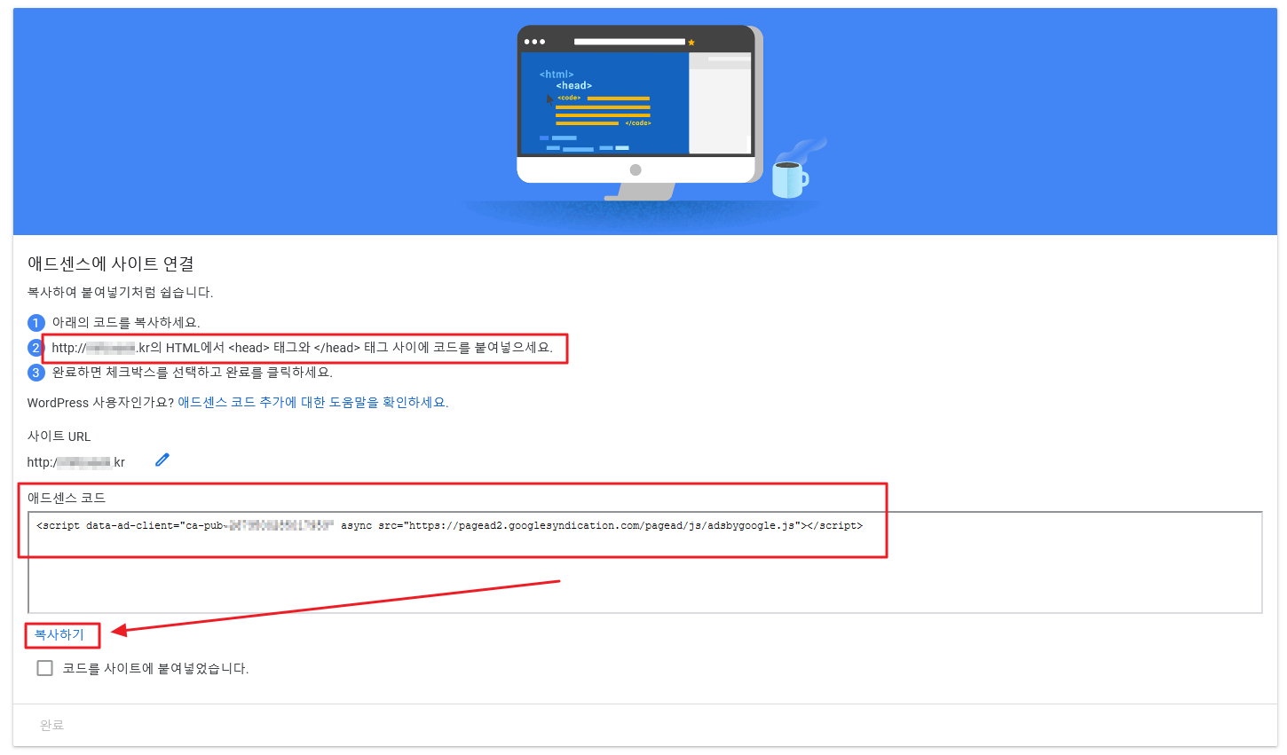 이제 다시 구글 애드센스로 돌아와서 (아까 닫으면 안된다고 했습니다.) 다음과 같이 복사하기 밑에 코드를 사이트에 붙였습니다. 앞에 체크를 하고 "완료"를 누릅니다.