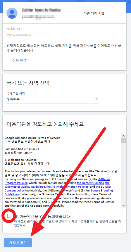 이제 아래와 같이 나오는데요. 여기서 국가를 선택하고 이용약관에 동의후 "계정만들기"를 누릅니다.