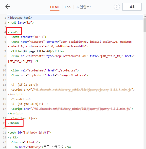 아래처럼 </head>위에 코드가 잘 들어있는 반드시 확인해주시고 안들어있으면 붙여넣기를 다시 하고 "적용", "새로고침" 까지 해주세요.