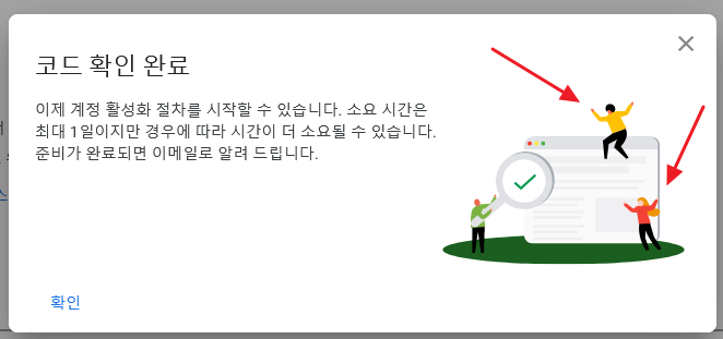 이제 계정활성화절차에 최대1일 또는 그이상 걸린다고 하면서, 준비가 완료되면 이메일로 알려준다고 합니다.