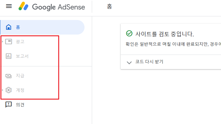 아래 빨간박스친 부분이 지금은 흐린 회색으로 비활성화 상태지만 사이트 검토가 완료되면 모두 진한 검은색으로 활성화 되게 됩니다.