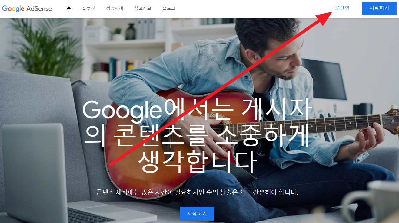 링크한 구글 애드센스로 들어갑니다. 화면 우측상단에 있는 "로그인"을 누릅니다.