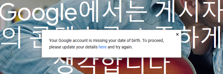 구글 아이디에 생일이 없나봅니다. here를 눌러서 작성합니다.