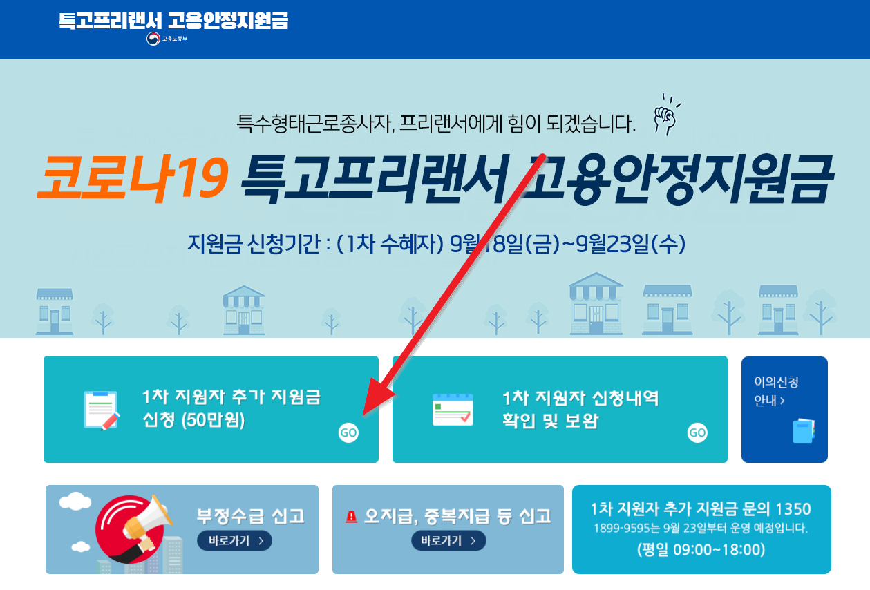 링크한 특고프리랜서 고용안정지원금 홈페이지로 들어가서 "1차 지원자 추가 지원금 신청(50만원)"을 누릅니다.