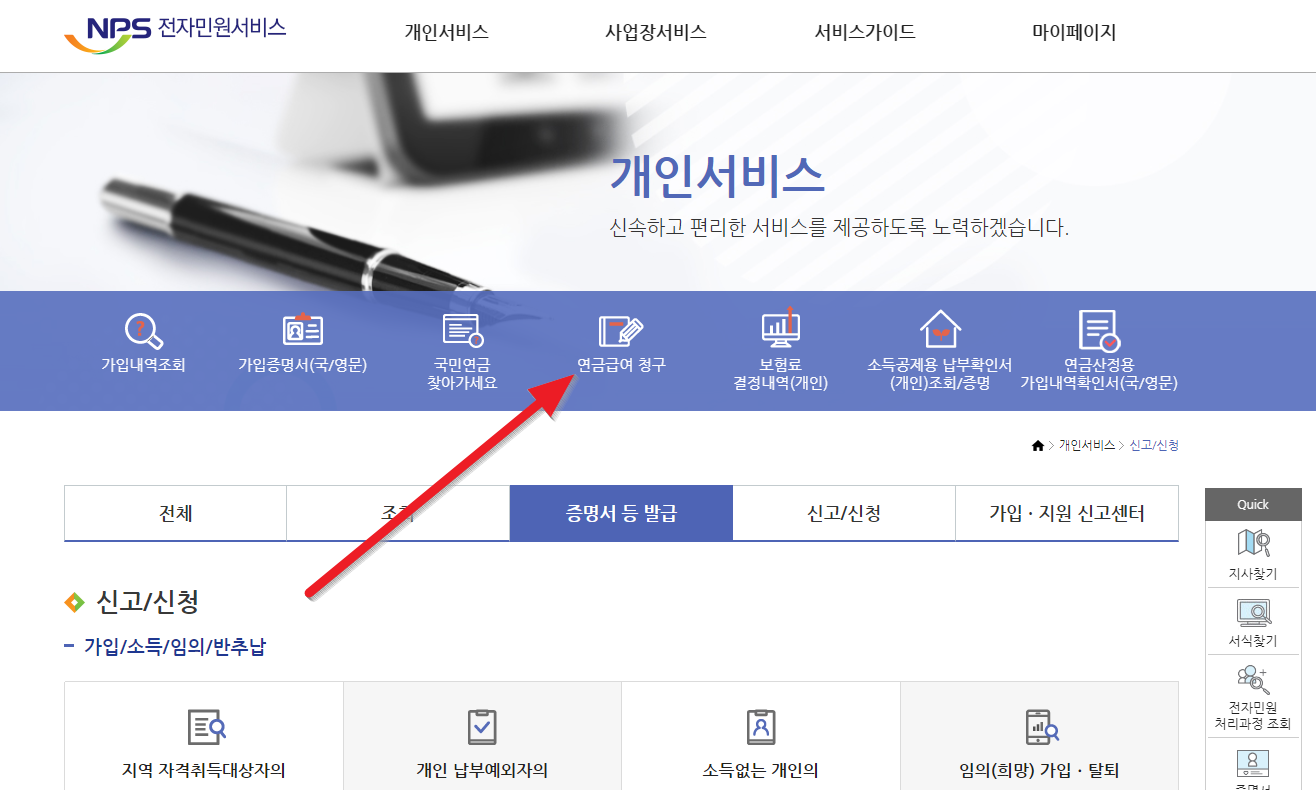 그러면 아래와 같은 화면에서 화살표가 가리키는 "연금급여 청구"를 누릅니다.
