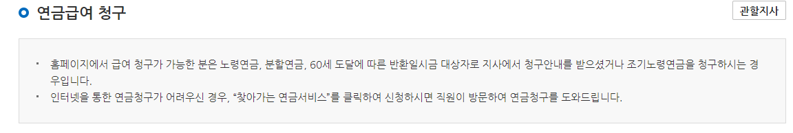 그러면 아래와 같은 화면에서 "연급급여 청구"를 하시면 됩니다.